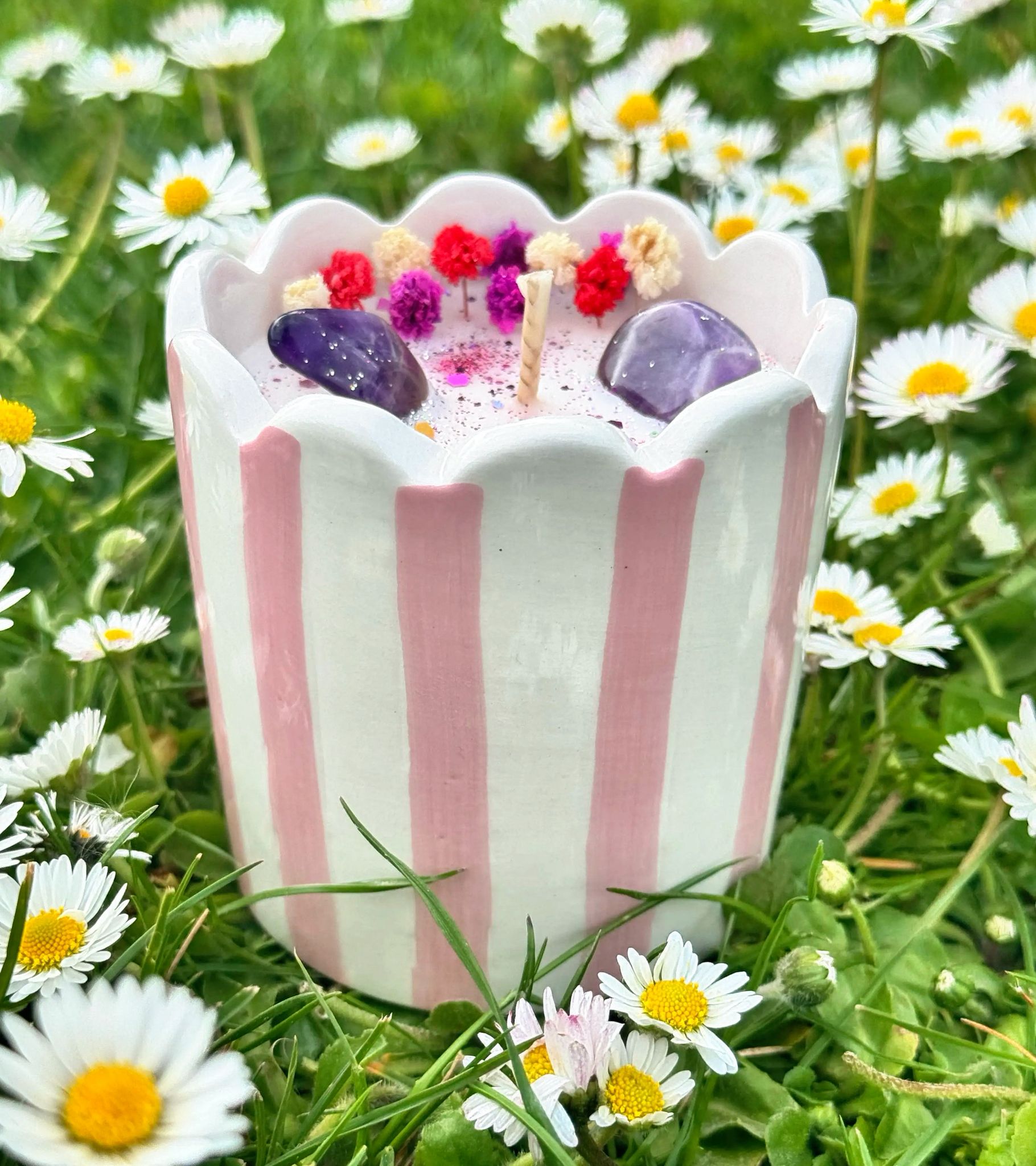 Ornée de pierres d’améthyste, symbole de paix intérieure et d’harmonie, cette bougie invite à ralentir, se recentrer… et simplement se déposer.